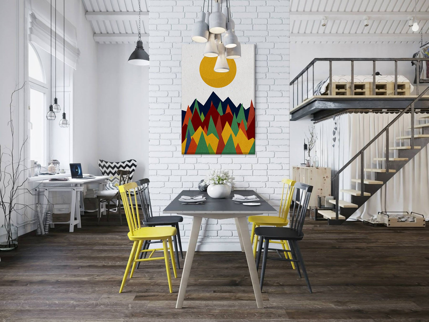 I colori del dipinto dovrebbero abbinarsi ai colori delle pareti e dei mobili, ma allo stesso tempo creare contrasto nella stanza secondo i vostri gusti. Se volete che il dipinto risalti nella stanza e diventi un elemento d'arredo di grande impatto, scegliete colori a contrasto sulla parete, come un dipinto più scuro su una parete chiara o motivi colorati in uno spazio neutro. D'altra parte, se preferite un aspetto più morbido e armonioso, scegliete colori che si abbinino delicatamente alle tonalità delle pareti e dei mobili, creando un effetto calmo ed equilibrato.